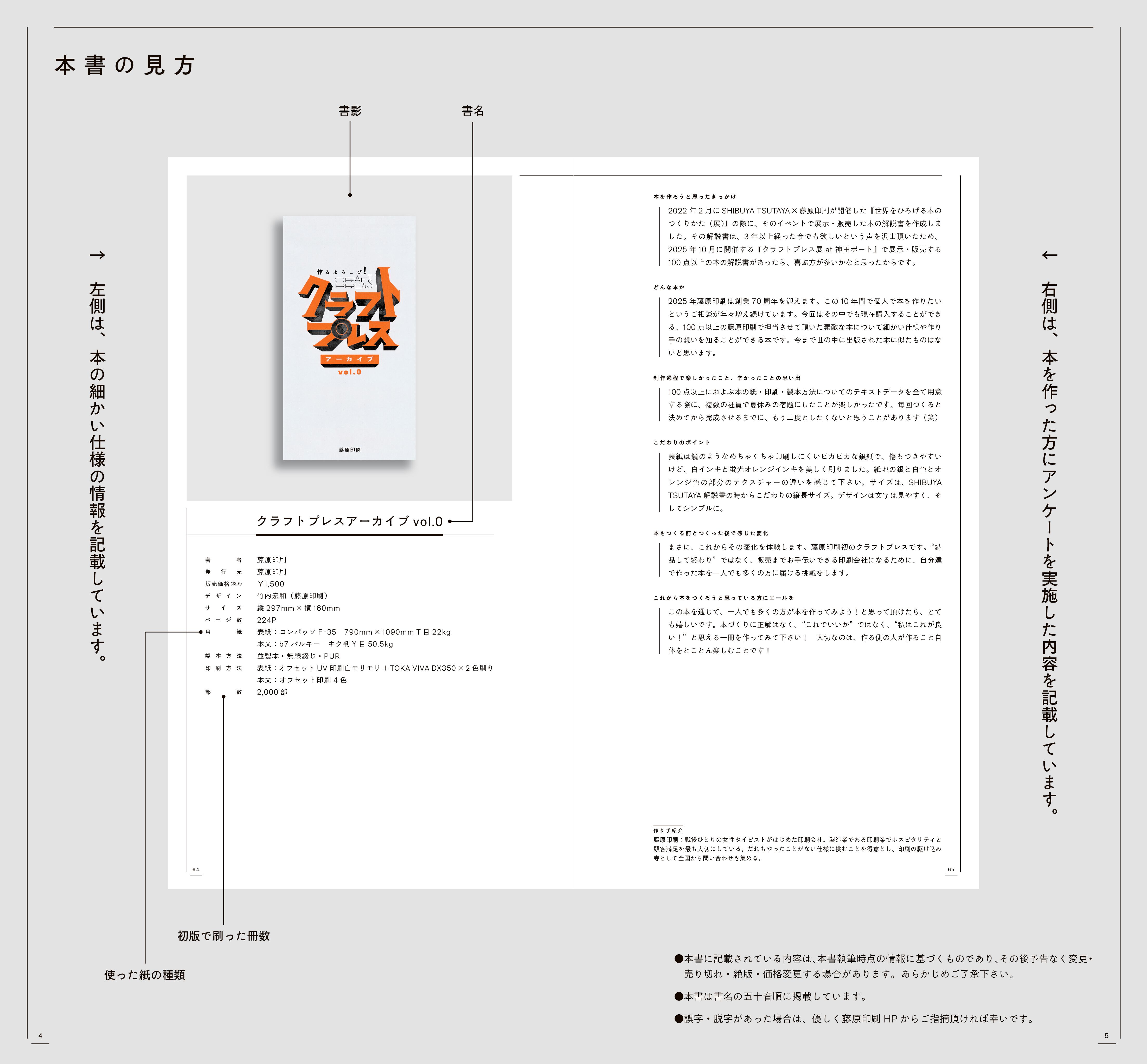 一冊につき見開き2ページを使い、紙面で紹介されているのは「藤原印刷で本を作った」ということだけが共通点の107冊。